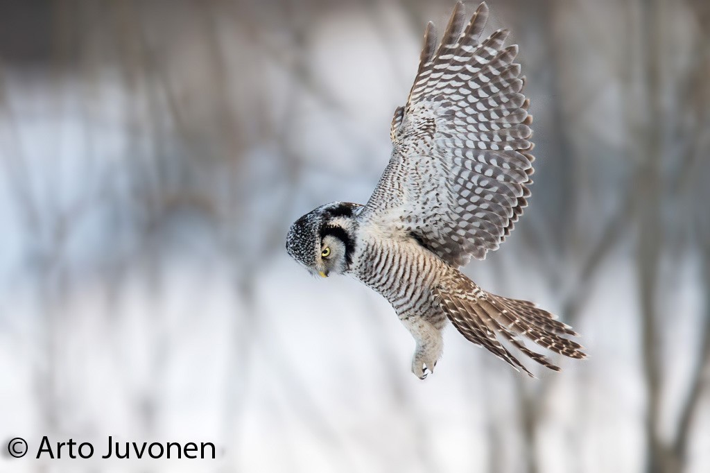 Quite many Hawk Owls are staying over winter in Southern Finland. One of them is hovering here.