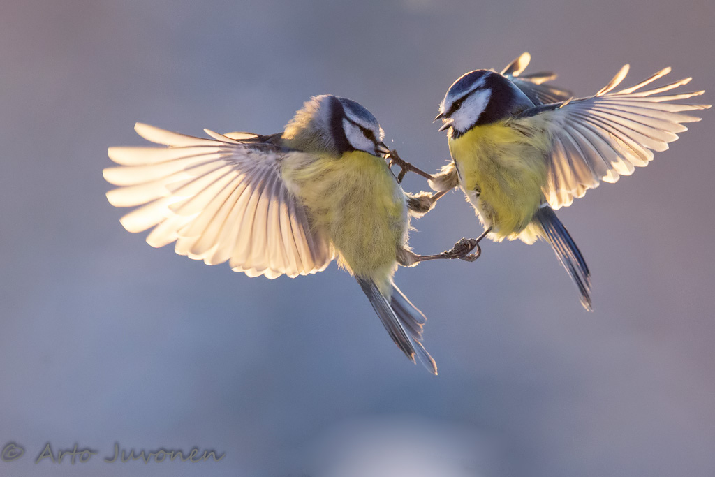 Viikon kuvassa taistelevat sinitiaiset metsäruokinnalla auringon laskiessa kuvattuina.