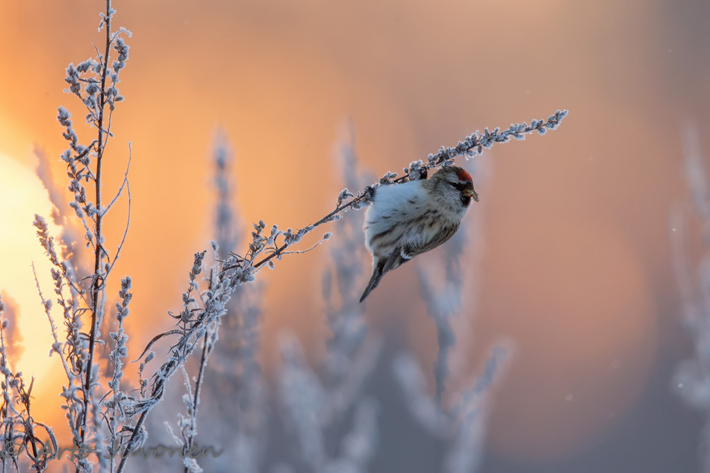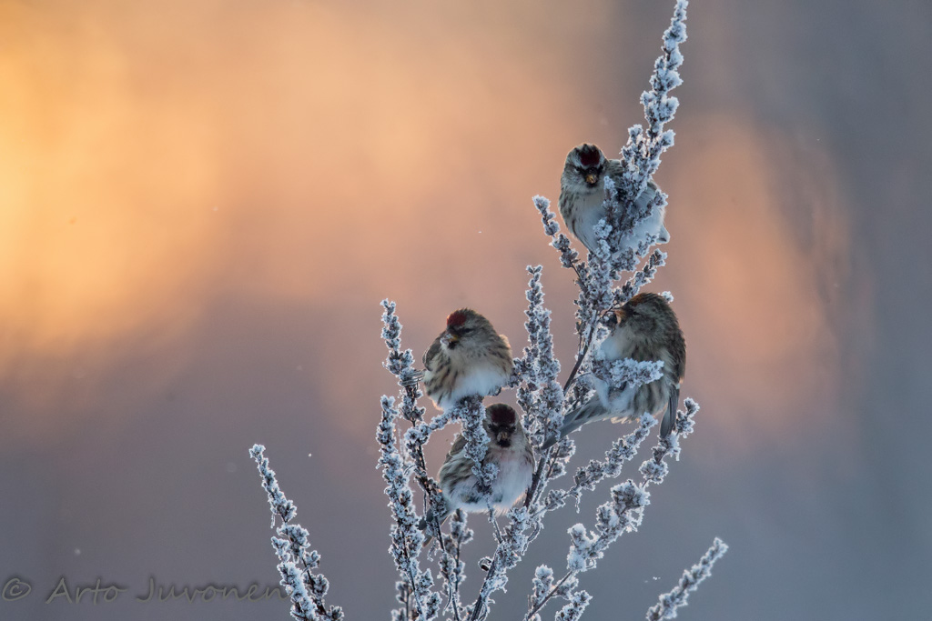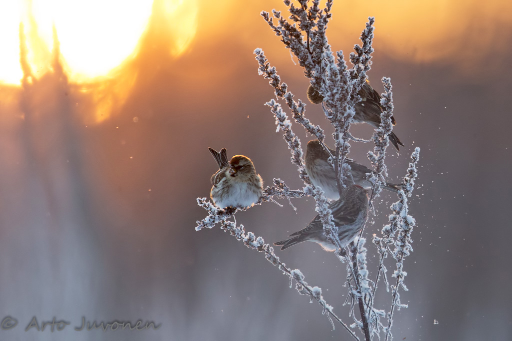 Lauantaina poistuin Ruskikselta, kun aurinko katosi Sikosaaren metsän taa. Matkalla kotiin huomasin tien vierestä pienen urpiaisparven. Kun aurinko täällä oli vasta katoamassa pienen metsikön puiden lomaan, tarjoutui oiva tilaisuus yrittää vastavalokuvia. Päivä parhaat syntyivät siinä tilanteessa.