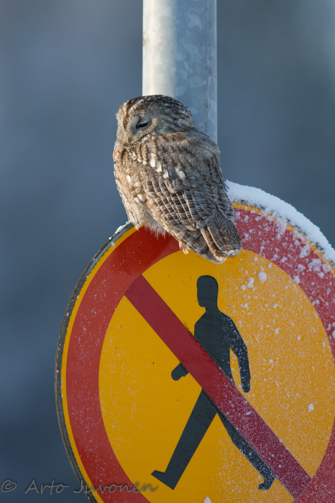 Moottoritiellä kohti Loviisaa ajaessani näin useamman harakan häärimässä vastakkaisen kaistan takana kioskin pihalla. Ne näyttivät hyökkäilevän kohti jotain, joten ei muuta kuin seuraavasta liittymästä alas, ja katsomaan mikä harakoilla mielessä. Kohde oli lehtopöllö istumassa liikennemerkin päällä! Kaikkea voi tulla vastaan.