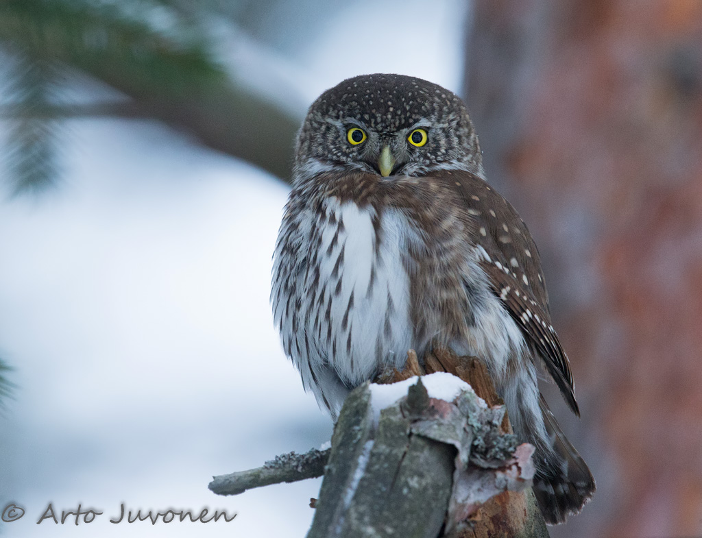 Merikotkista ei kummoisia kuvia syntynyt. Viikkari syntyi pienen pellon reunasta, johon pysähdyin pöllöjä kiikaroimaan. Tikan varoittelu paljasti varpuspöllön kuusen latvassa. Jonkin aikaa odoteltuani, pöllö valpastui ja lensi alas metsään. Mitä lie pelästyi, minä en nähnyt mitään. Vaikka toivottomalta tuntui, päätin mennä katsomaan, josko pöllön löytäisin metsästä. Ihme kyllä - löysin.