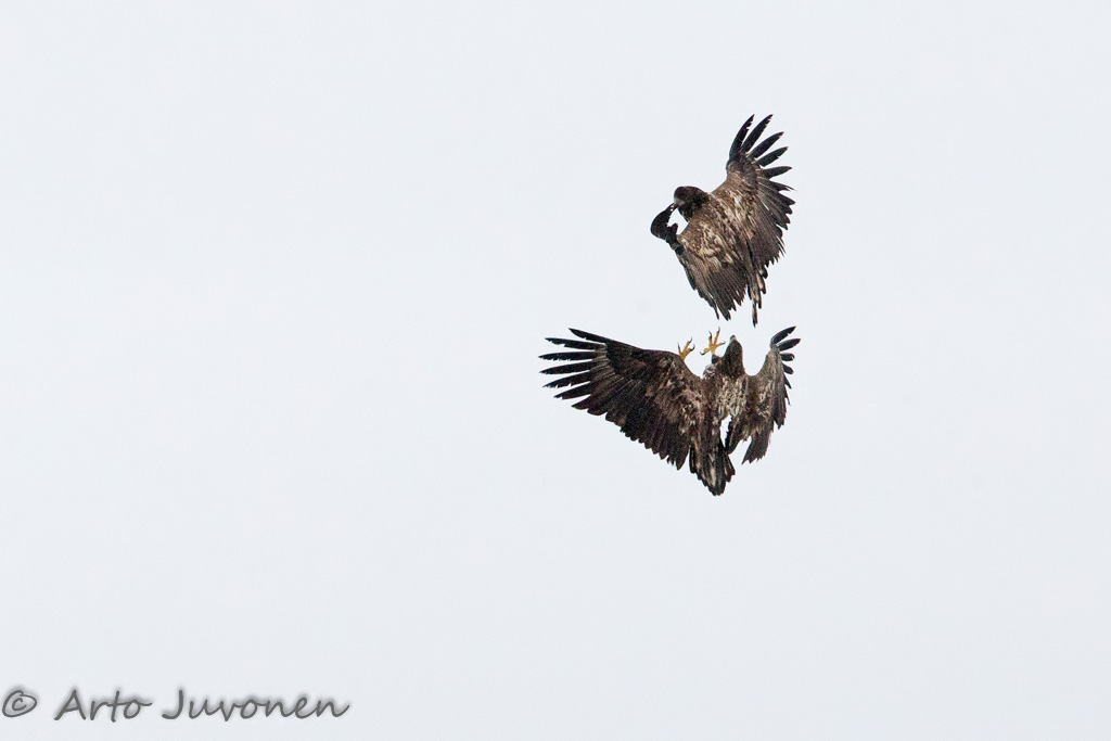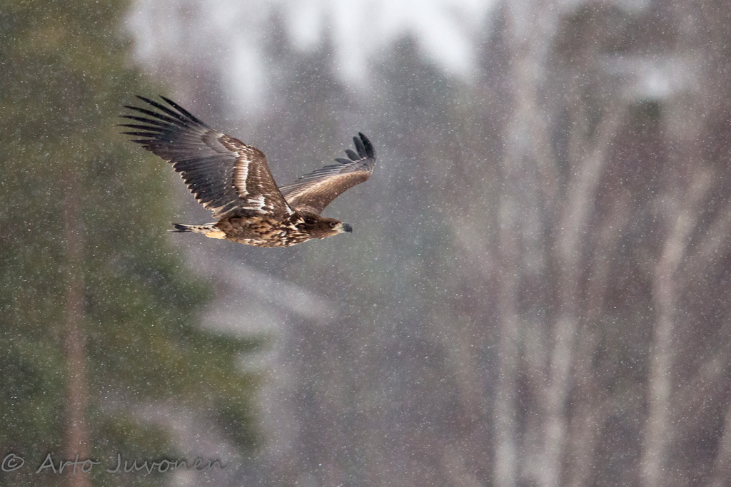 Lauantaina iltapäivällä ajoitin meren jäälle menon sääennusteen mukaan yrittääkseni lumipyrykuvia. Merikotkia oli parhaimmillaan tusina yhtä aikaa näkyvissä. Jotain kuviakin syntyi, mutta suurin osa kotkista siirtyi pyryn alkaessa metsiin. Sentään yksi nuorukainen jäi, jäälle tehden lopuksi lähiohilennon matalalta niin, että lumipyry näkyi hyvin taustan metsää vasten.