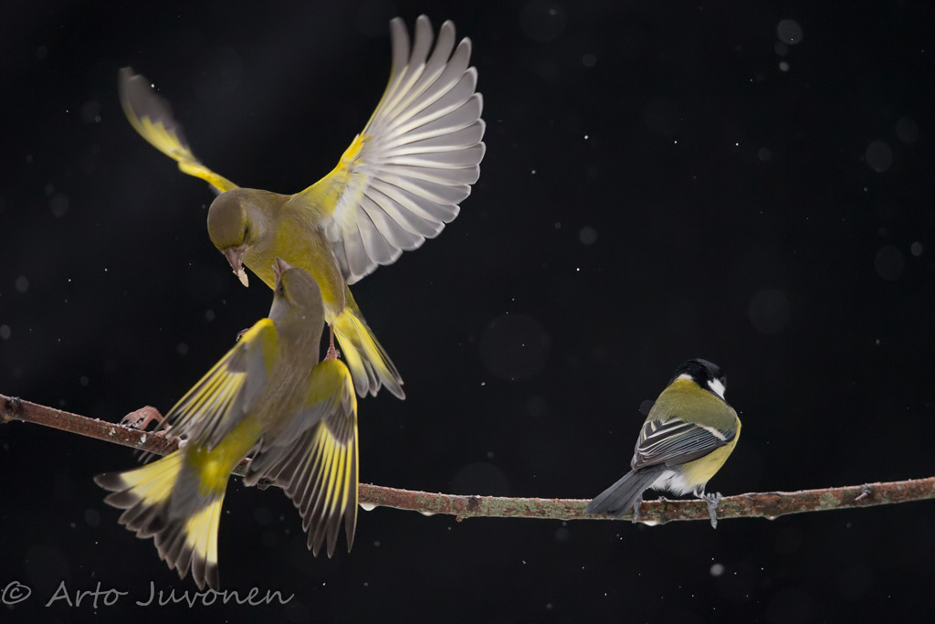 Viikkarissa talitiainen väistyy viisaasti sivuun tappelevien viherpeippojen tieltä.