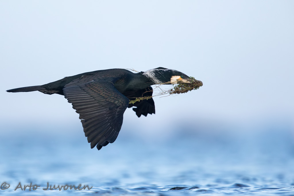 A Gret Cormorant is carrying some nest building material in the picture of the week. White-tailed Eagles are strongly disturbing live of Cormorant colonies. During my visit (an evening and morning) the Eagles visited almost ten times in colonies.