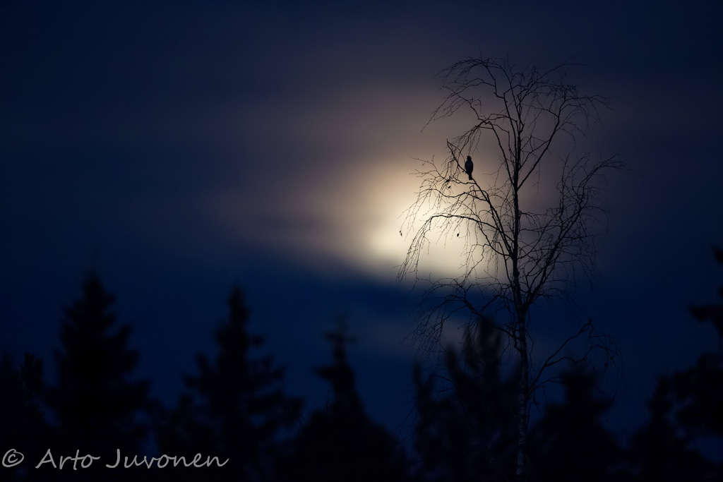 Täyskuuyön ainoa tavoite oli saada kuusen latvassa laulava laulurastas ja täyskuu samaan kuvaan. Ihan täysin en onnistunut. Sain kyllä kuuset, laulurastaan ja täyskuun samaan kuvaan, mutta kute näette, kuu oli pilviverhon takana ja rastas koivussa.