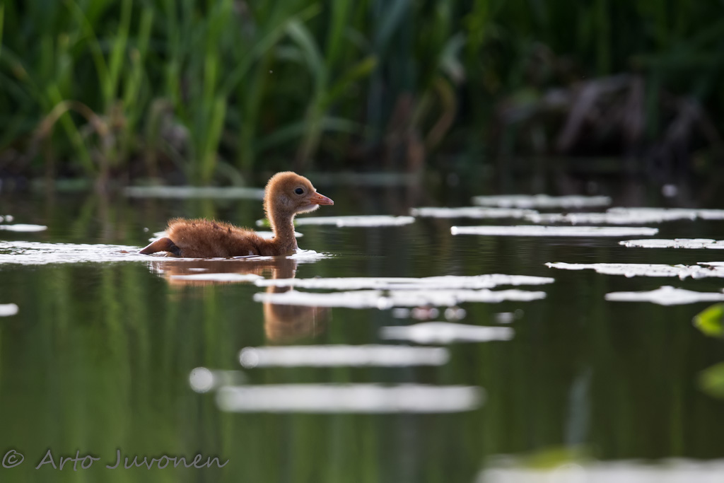 On hienoa, kun pääsee tutustumaan aiemmin minulle tuntemattomaan hienoon lintupaikkaan. Sellaisiakin vielä löytyy, vaikka retkeilytunteja alueella on jo kohtuullisen paljon. Kävin kumiveneellä Jouni Revon löytämää ruokosirkkalintua kuvaamassa Kymijoen läntisen sivuhaaran varrella sijaitsevalla Suvijärvellä. Kumivene sähkömoottorin kera on hieno kulkuväline lintuvesillä. Sen kanssa voi kiireettömästi kulkien kuunnella ympäristön ääniä pahastikkaan ympäristöä häiritsemättä. Hiipivä lähestyminen voi olla myös pahasta, kuten nyt kun törmäsin äskettäin liikkeelle lähteneeseen kurkipoikueeseen. Emot eivät ehtineet ohjata poikasiaan turvaan ajoissa, vaan untuvikot pakenivat uiden veneen edestä. No mitään vahinkoa ei tietenkään tapahtunut, paitsi tietysti hetkellinen järkytys kurkiperheelle.
