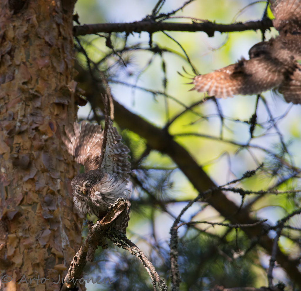 Tiistaina oli taas onnea mukana. Liikkuessani hiljaisilla teillä, ajelen sään salliessa aina ikkunat avoimena. Taaskin kannatti. Tällä kertaa matkan pysäytti metsästä kuuluva kiivas pikkulintujen varoittelu. Pysäytin auton ja siirryin tien sivuun kuusikkoon. Mitään syytä varoittelulle ei näkynyt, mutta se jatkui kiivaana edelleen. Kokeilin viheltää varpuspöllöä, ja sillä tärppäsi heti. Koiras varpuspöllö aloitti välittömästi vastaviheltelyn, ja heti perään alkoi kuulua naaraan kerjuuääni. Koiras jatkoi viheltelyä, jolloin naaras luuli ruokalähetyksen olevan tulossa, hyökäten varsin agressiviisen näköisesti koirasta koti. Tämä toistui muutaman kerran. Alhaalla on yksi kuva tilanteesta. Pesä paikantui melko korkealle männyn tikankoloon.