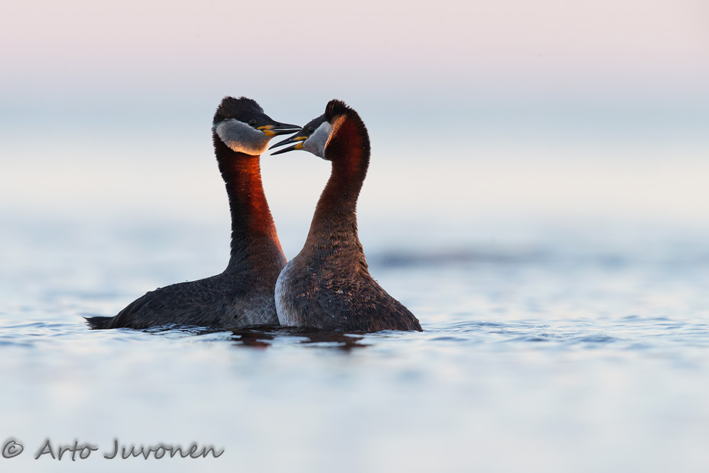 Kulunut viikko oli merelle pääsyn kyttäämistä. Loppujen lopuksi pääsimme keskiviikkoiltana vihdoin lähtemään, mutta silloinkin vain lyhyemmän avomerimatkan päähän Loviisan Bysketiin. Toki kyseinen saari on perinteisesti toiminut hyvin kuvauspaikkana. Tällä kertaa yllätyksen järjesti härkälintupariskunta, joka iltavaloissa tuli uiskentelemaan kivikkoon, jossa vielä parittelivat ja soidinsivat. Hauskaa oli seurata, kun pariskunta haki pesäpaikkaa matalien vesikivien päällystöjä tutkiskellen. Tietenkään ne eivät voi asettua pesimään tuolle laivaaaltojen ja avomeren myllerrysten huuhtomalle rannalle. Härkälintu rakentaa kelluvan pesänsä vesikasvuston sekaan.