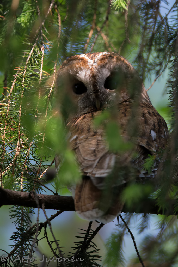 Keskiviikkoaamuna olin taas lintuhälytyksen jäljillä. Mustarastaiden ja peippojen suuri hätä oli helposti paikannettavissa, mutta syytä en meinnannut millään löytää. Poistuin jo kerran paikalta, kun mitään ei näkynyt, ja varoittelukin laimeni. Varoittelu alkoi kuitenkin uudelleen kiivana, joten palasin vielä paikalle. Pienen seurannan jälkeen paikka tarkentui pienehkön kuusen harvan latvuston oksistoon. En voi käsittää, kuinka hyvin lehtopöllö voi maastoutua moiseen paikkaan.