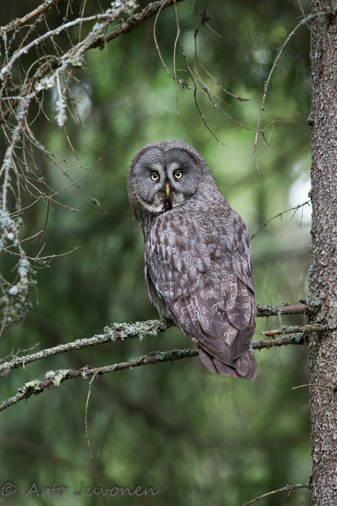 I have wait hours below a nest of GG Owl waiting for something to happens. So far nothing, but now on 3rd July at last at least two nestlings heard to make food-call from nest. And the female take a short fly trying to get some food. It is amazing to see this large Owl flying inside dense wood so easily, making quick turns with soundless wings. Nesting have started really late, have started around middle of May