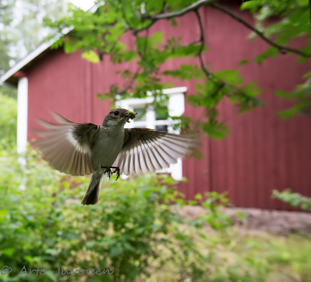 Pied Flycatcher flying to a nesting box. Our summer cottage at background.