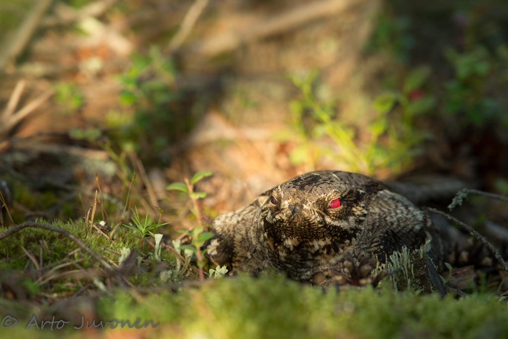 Matkalla töihin käväisin tarkistamassa, joko poikasien päät näkyisivät niitä lämmittävän kehrääjäemon alta. Eivät näkyneet, mutta paikalta poistuessani näin punaisen välähdyksen kehrääjän silmistä. Peruutin heti takaisin ihmettelemään mistä punaväri syntyi. Opin, että nousevan auringon valon ollessa juuri katoamassa omaan varjooni, kehrääjä toinen silmä loisti kirkaan punaisena, toinen himmeämpänä valon kulmasta johtuen. Ajattelin kyseessä olevan salamakuvauksissa syntyvä ns. punasilmäefektin, vaikka en muista kertaakaan aiemmin nähneeni punasilmäefektiä luonnon valossa. Internetin tietopankki kertoi kuitenkin, että yöllä liikkuvilla eläimillä - linnuista kehrääjillä ja pöllöillä - on Tapetum lucidum, eli valoa heijastava kerros verkkokalvon takana, joka heijastaa silmään tulevan valon uudestaan näkösoluihin hämäränäköä vahvistamaan. Kehrääjällä tämä Tapetum lucidum näkyy punaisena, eli kyseessä ei ole sama punasilmäefekti joka tekee meille päiväeläimille punasilmät salaman välähtäessä.