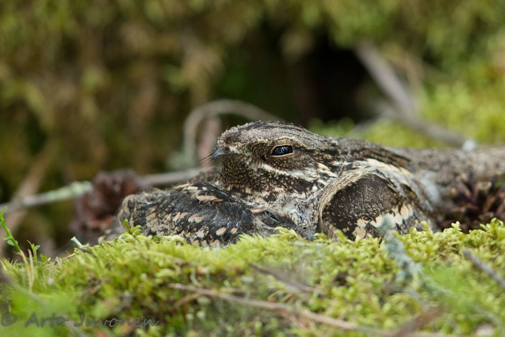 A late nesting of a European Nightjar. Hatching was around 3rd of August. That means fledgings to be independent at beginning of August. Luckily we seems to get a quite warm August (even nights are quite chilly), so the fledglings have good chance to manage into flight. Thanks to Pekka Oksanen.