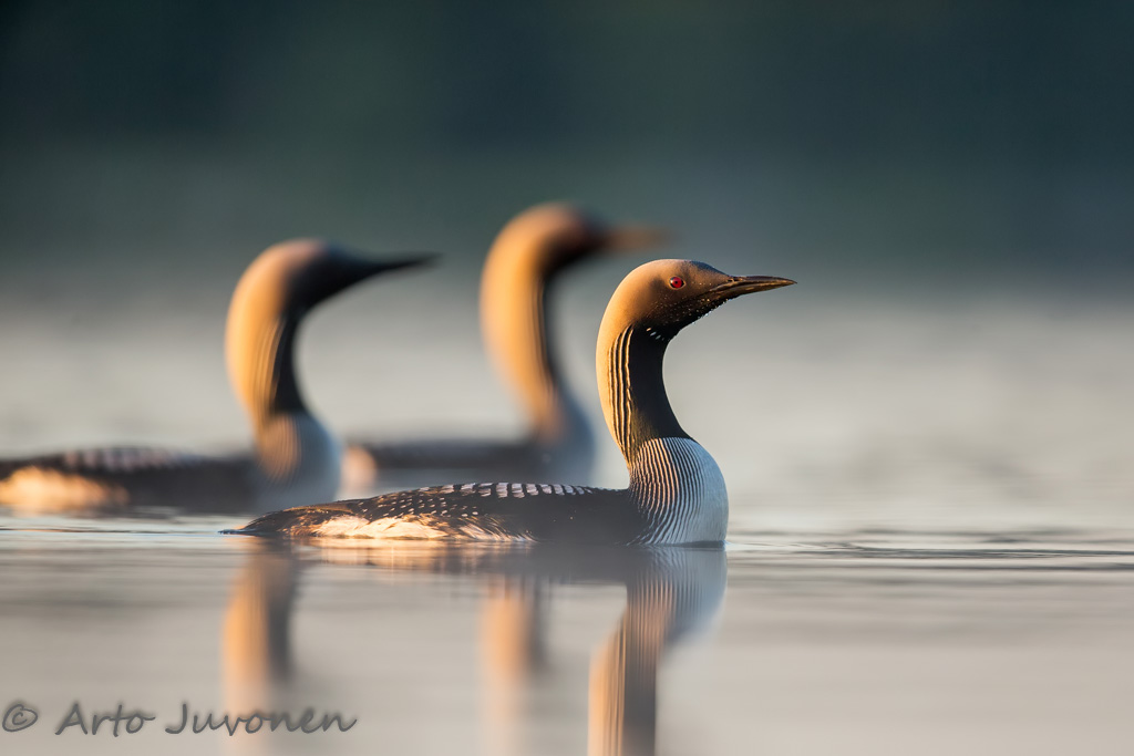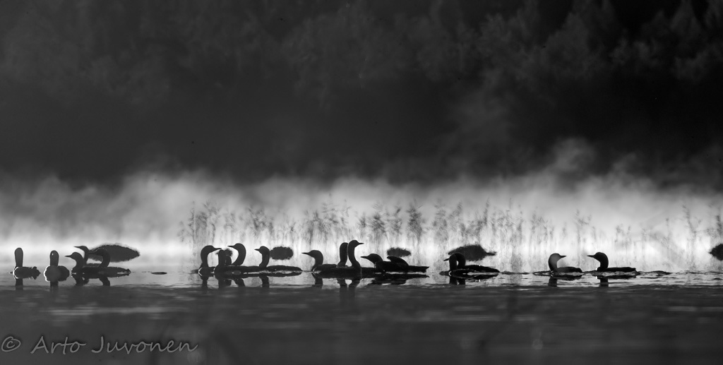 Pidin viikolla pari lomapäivää. Aikomuksenani oli viettää ne merellä, mutta siellä oli kuitenkin niin lintuköyhää, etten jäänyt yöksi. Toisen päivän aamuksi suuntasin kuikkajärvelle mielessäni aamu-usvakuvat. Kuikkia olikin paikalla komea 27 yksilön parvi, josta osa kävi aika lähellä kellupiiloani. Minut ohitettuaan parvi siirtyi vastavaloon kalastelemaan.