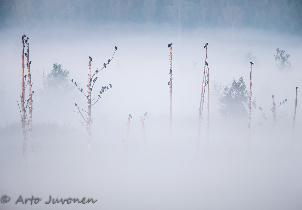 Hooded Crows and Jackdaws at misty morning after rainy night.
