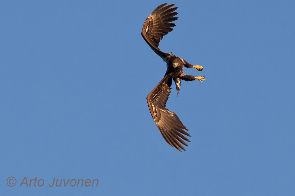 Lauantai-iltana ensin tapahtui kaksi vanhan merikotkan järjestämää takaa-ajoa. Toinen hyökkäyksistä jatkui kauas metsän taakse - ei tietoa lopputuloksesta. Sitten vähän ennen auringonlaskua tuli esiaikuinen merikotka, joka kääntyi hienosti syöksyyn melkein pääni päältä kohteena yksin peltoon jäänyt hanhi. Siitä alkoi vauhdikas takaa-ajo, jonka aikana hanhi ja kotka kiersivät peräkanaa Lapinjärven siviilipalveluskeskuksen männikkö pariin kertaan (niiden jotka sanovat merikotkaa kömpelöksi, olisi pitänyt olla näkemässä!). Takaa-ajo päättyi hanhen pudottautumiseen veteen. Alkoi pidemmän aikaan kestänyt väsytys, johon toimeen nuori merikotka sai avukseen vanhan valkopyrstön: kotkat hyökkäsivät ja hanhi sukelsi. Lopputulos oli harmillinen. Useaan kertaan kotkan kynsillä kouraistu ja välillä vähän kanneltu hanhi koki turhan kuoleman, kun vastarannalta liikkeelle lähtenyt vene karkotti kotkat. Kuollut hanhi ajautui navakan tuulen mukana kohti ruovikkoa kotkien ulottumattomiin.