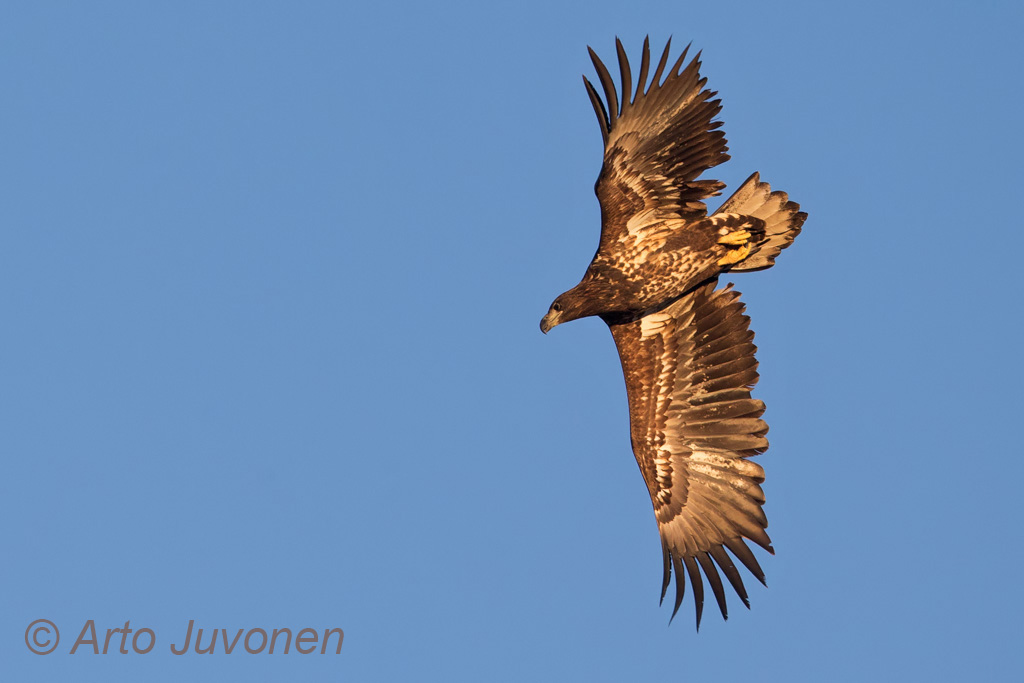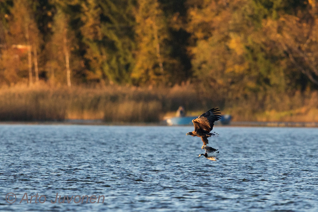 Sunnuntaina näin pari epäonnistumista vauhdikkaassa takaa-ajossa, sekä saalistuksen vedestä, joka oli kuin toisinto lauantai-illasta. Samat kaksi merikotkaa väsyttivät muusta parvesta erilleen jäänyttä hanhea. Tällä kertaa tuli uistelijan vene, joka katkaisi kotkien saalistuksen. Kovia kokenut hanhi ajautui vähitellen rantaa kohti. Tämä oli sitä oikeaa avaraa luontoa, mutta tuli vähän paha mieli turhasta tuskasta.
