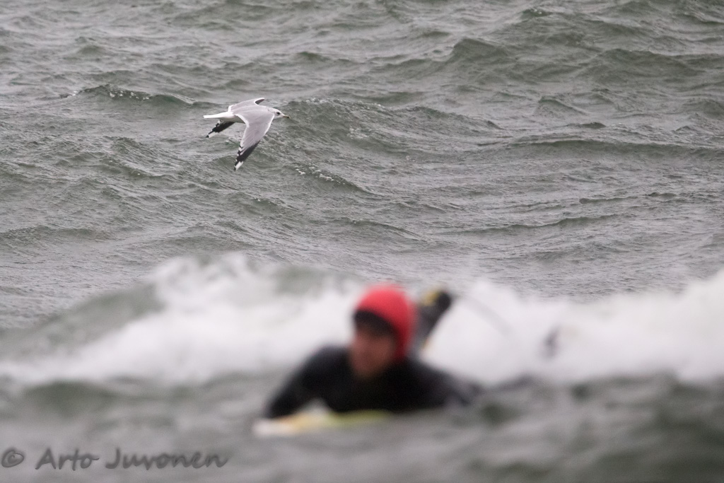 Tänään, ja viikko sitten, tuuletin kameralaitteistoa Emäsalon kärjessä. Komea oli myrsky, mutta myrskyn voiman saaminen samaan kuvaan linnun kanssa ei ole helppoa. Lähimmäksi tavoiteltua pääsin tällä kuvalla, jossa etualan lainelautailijan näkyminen kuvassa kertoo, että aallot olivat isot. Sitkeitä kavereita nämä lautailijat muuten - pari tuntia yhteen menoon märkäpuvun kanssa muutaman asteen lämpöisessä ilmassa ja vedessä.