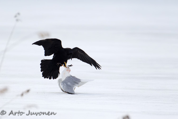 Juhan tarinassa korppi sai toisen kaveriksi, mutta kalanpään herruus ei sillä ratkennut. Kuuden korpin yhteistoiminta ratkaisi tilanteen mustien lintujen eduksi. Minun tarinassani ei leikitty. Yksi onneton haraalokki ei ehtinyt väistyä lahnan ääreltä korpin taas palatessa. Nyt korpille ei riittänyt, että harmaalokki tajusi yrittää pakoon korpin syöksyessä sen selkään. Seurasi noin viiden minuutin taistelu "yhteen maaliin". Verinen näytelmä päättyi harmaalokin kuolemaan.