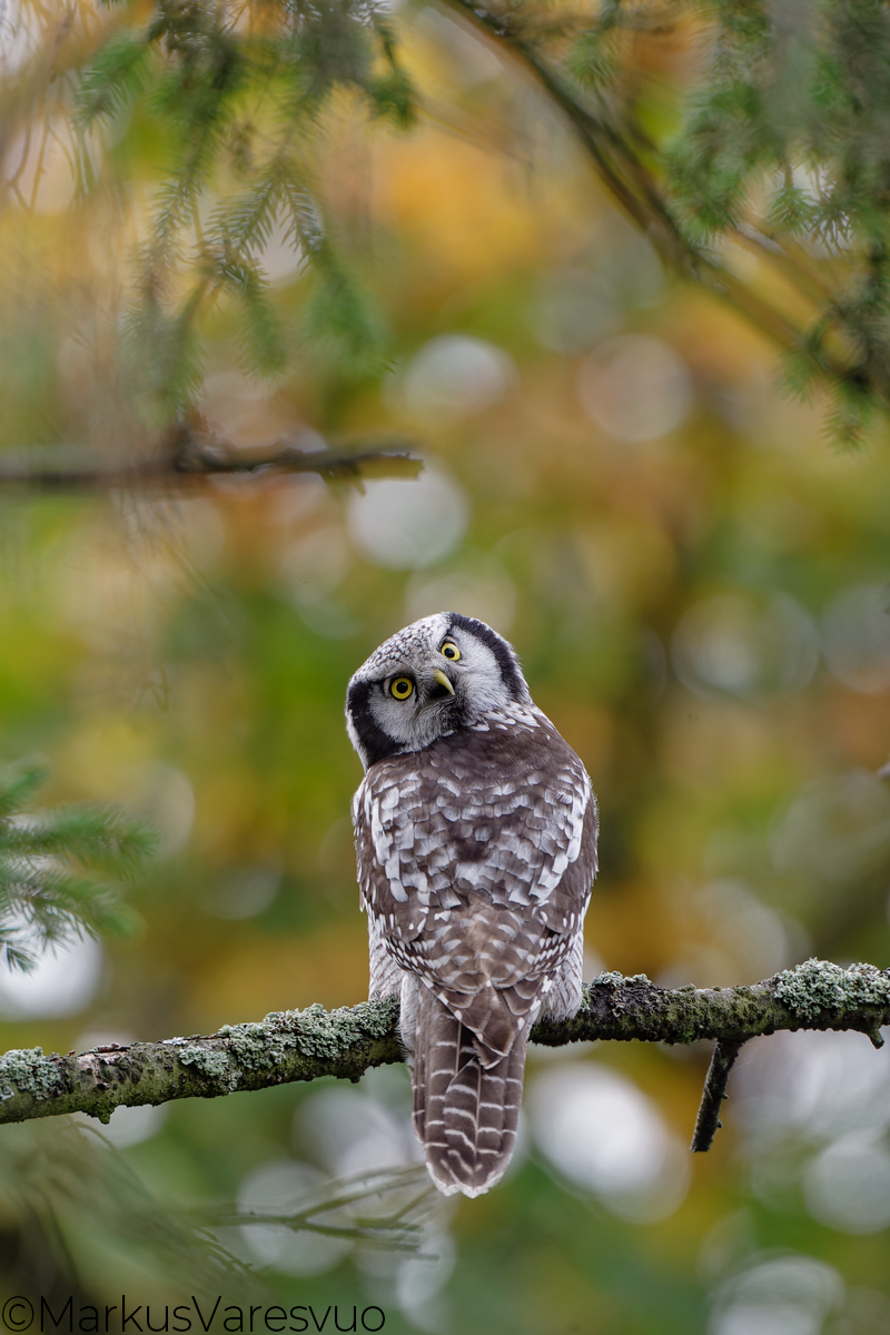 Aperture F-number f/5.6 Exposure Time: 1/200 ISO: 320 Image information: Hawk Owl (Surnia ulula) Helsinki Finland October 2005 Time from camera: 2005:10:20 Copyright: Markus Varesvuo Pursilahdenranta 2B22 00980 Helsinki Finland +358405033831 markus.varesvuo@lintukuva.fi Camera: Canon EOS-1Ds Mark II Focal Length: 700/1 | |