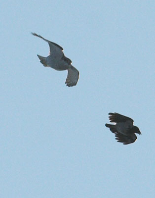 Pitkät tunnit kanahaukan touhuja seuraten alkavat opettaa. Kanahaukan tarkkailukierroksen jälkeen osasin arvata paikan, josta haukka seuraavan kerran lentää yli. Asetin aukon esivalinnan lievälle himmennykselle, otin kameran irti jalustalta ja jäin odottamaan. Se tulikin aivan suoraan yli hienosti vasten sinitaivasta. Varislintujen parvi nousi paniikissa ilmaan, keräsi kiivaasti korkeutta ja lensi haukan lentoa vastaan sen yli. Kanahaukka meni suoraviivaisesti ainakin kilometrin verran yli alueen, kaartoi laajan kaarroksen ääripisteessä ja tuli sitten kovaa takaisin. Varislintulauma käänsi puolestaan kurssinsa päinvastaiseksi ja otti edelleen korkeutta. Yksi erillään lentävistä variksista lukkiutui maaliksi. Kaksi kiinniottoyritystä ilmasta varis väisti ja pudottautui alas kuusikkoon kanahaukka perässään. Kuvaajan kannalta valitettavasi saalistus tapahtui tällä kertaa suoraan auringon suunnassa. Varis jäi kuusen sisäoksille haukan istuessa läheisessä puussa. Heti jos varis yritti nousta, haukka ampaisi perään. Lopputulosta en tiedä.