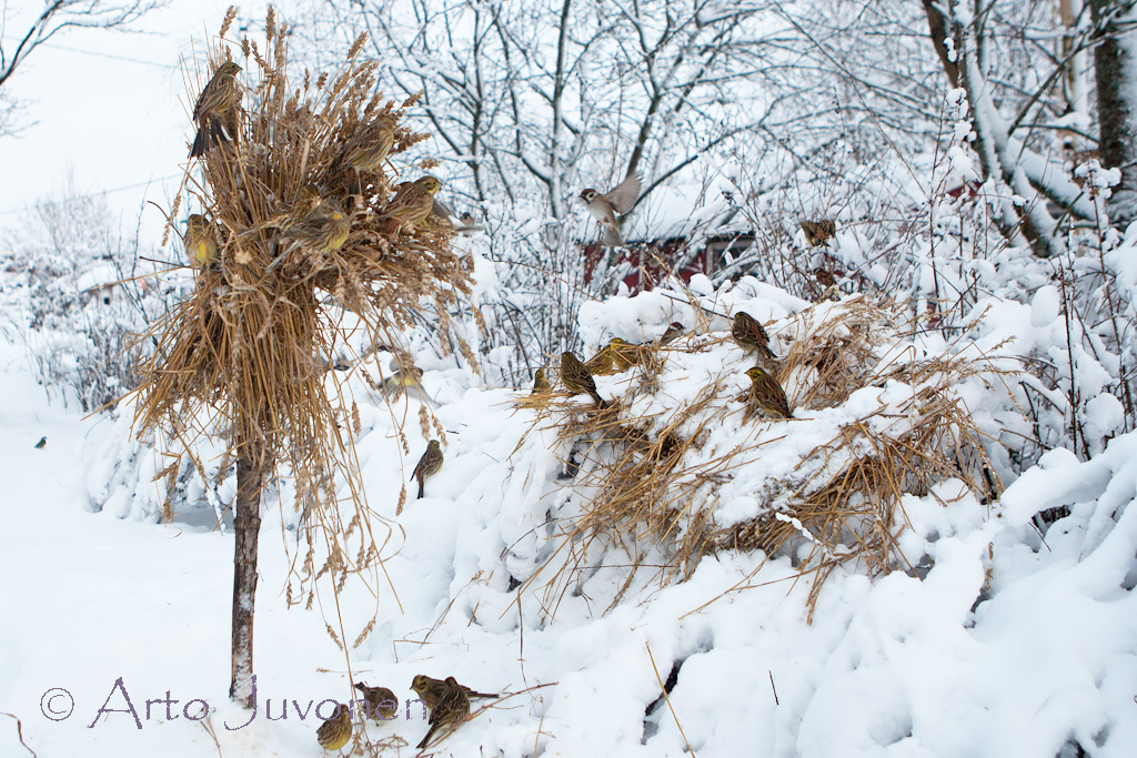 Snow cover has finally so thick that Yellowhammers have got at feeding places. At our cottage garden was around 80 Yellowhammers and same amount of Tree Sparrows. Sheaf of Wheat is works well as food for winter birds and also for me as bird photographer.
