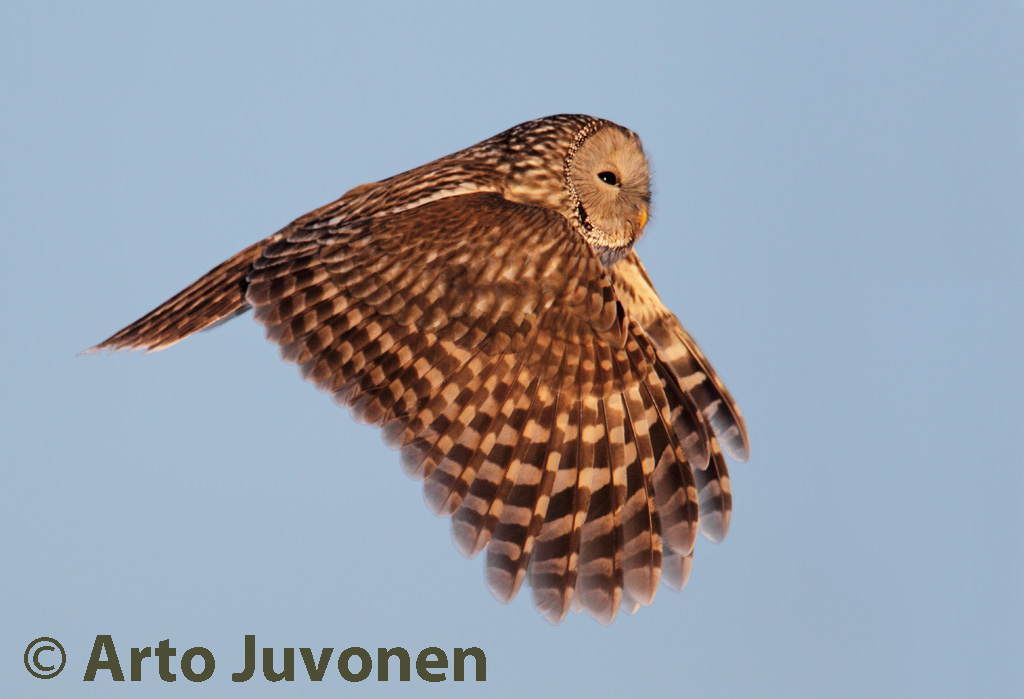 Lauantain upean talvikelin retken kruunasi viirupöllön kohtaaminen loistavassa valossa. Sattumoisin näin pellolta saalistussyöksyn jälkeen pellon reunuspuuhun nousevan viirupöllön. Tuumin, että josko tuo syöksyisi toistekin ja siirryin pellolle myötävalon puolelle tähyilevästä pöllöstä. Kauaa ei tarvinnut odottaa, kun pöllö teki uuden yrityksen. Kameran tarkennus seurasi virheettömästi pitkää pöllön liitoa taustan vaihdellessa sinitaivaasta aina tummaan lumesta kirjavan kuusikkoon.