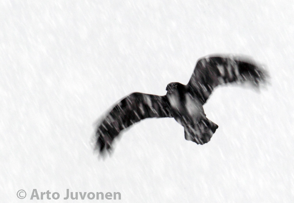 Kokeillaan nyt tällaisella taidekuvalla, kuinka puree arvostelijoihin. Viikonkuvassa näkyy viikonvaihteen sää - sakeaa lumisadetta. Havaintotilanteessa lumisade vasten tummaa lintua näytti kivalta. Valotusaika 1/125 kasvatti hiutaleet viiruiksi ja jätti siiven liikeen näkyviin.