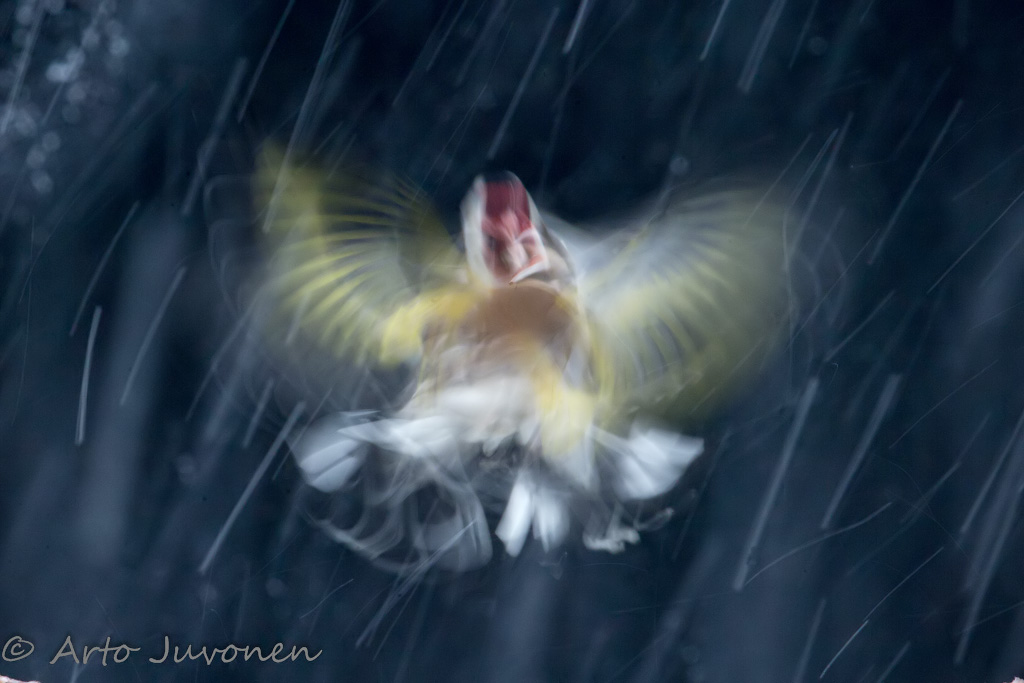 Today we had some snowing. I stay whole day at our backyard, where I have possibility to get snowing visible against black background. I took a lot of pictures with long exposure time -the idea was get some special of bright colored Goldfinches.