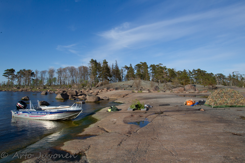 Kerrankin otin retkikuvan. Alla ylimpänä meriretken majoitupaikka. Viikkari syntyi tuon retken tuotteena. Lähdin launatai-iltana merelle tarkoituksena kuvata ilta- ja aamuvalot saaren somerikkoriutalla. Kuvasin iltavalot vähän liian aikaisin ja jouduin ihastelemaan varsinaisen auringonlaskun maista käsin. Lyhyiden yöunien jälkeen olin juuri auringonnousussa kuvausasemissa. Merisääennuste lupasi varsin tyyntä keliä, mutta launatai-illan aallokko oli vielä epämukavan levoton kellupiilon kanssa liikkumiseen. Aamulla oli parempi. Retken ajatuksena oli hakea jotain erilaista kuvaa peruskuvien sijaan. Sellainen syntyikin. Nyt odotan mielenkiinnolla kommentteja!