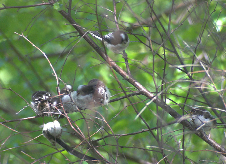 I found a nest of Long-tailed Tits on beginning of April. Now after two months of that, youngster left the home. Every now and then all family moved some twenty meters to a new place and fledgings spreaded to smaller groups, but soon all team re-formed again, 11 young ones sitting together side by side. And parents were busy to feed them!