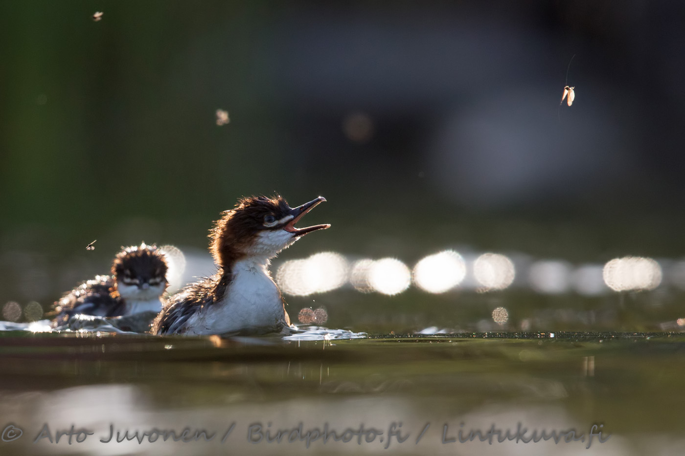 Aina ei tarvitse piiloutua päästäkseen lähelle lintuja kellun kanssa. Kun on pitkään paikallaan vedessä, aina niin arat vesilinnut hyväksyvät vedestä nousevan ihmisen pään osaksi muuta vedessä kelluvaa. Vaikka pyörin aika vauhdikkaasti kuvauskohteeni kalastavan räyskän lentoa seuraten. Ensin kuljetti isokoskelonaaras ison untuvikkokatraansa aivan lähelleni, sitten ui silkkiuikku vieritse, telkkä tuli sukeltelemaan helposti saavutettavalle kuvausetäisyydelle, valkoposkihanhet kuljettivat poikueensa ohitseni ja vielä merimetso tuli kalastelemaan tuntumaani. Kun tämä kaikki tapahtui ympärilläni ja vielä kun koskelopoikue asettui nukkumaan laiturille juuri paikkaan, josta minun olisi pitänyt nousta maihin, toivoin jo kovasti jonkun muun aiheuttamaa häiriötä ihan vaan siksi, että itse olisin päässyt vedestä lintujen rauhaa häiritsemättä.