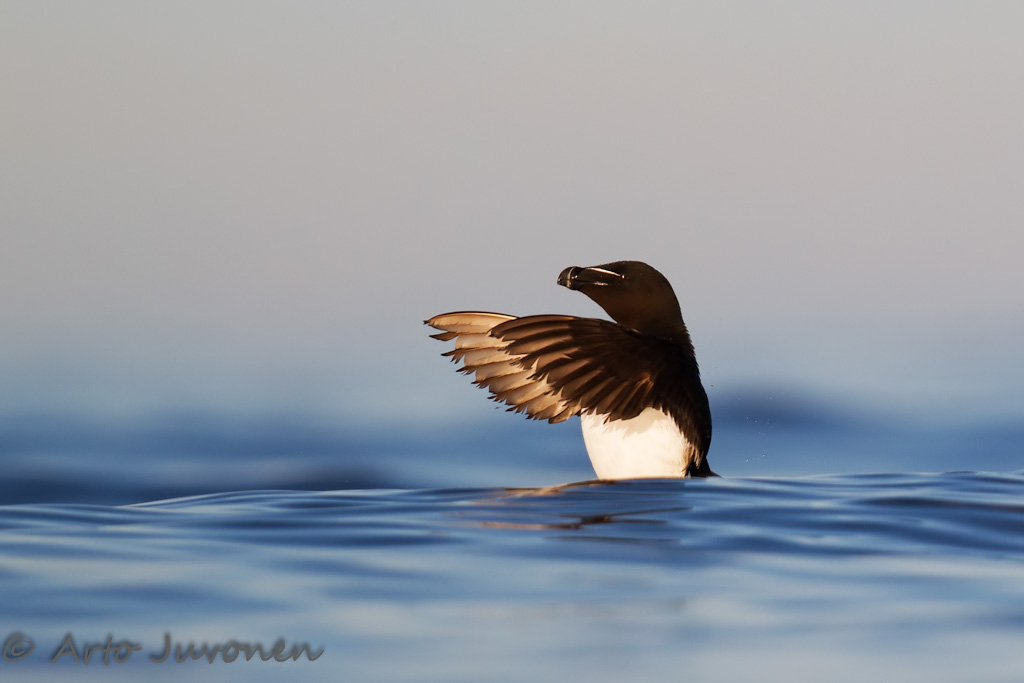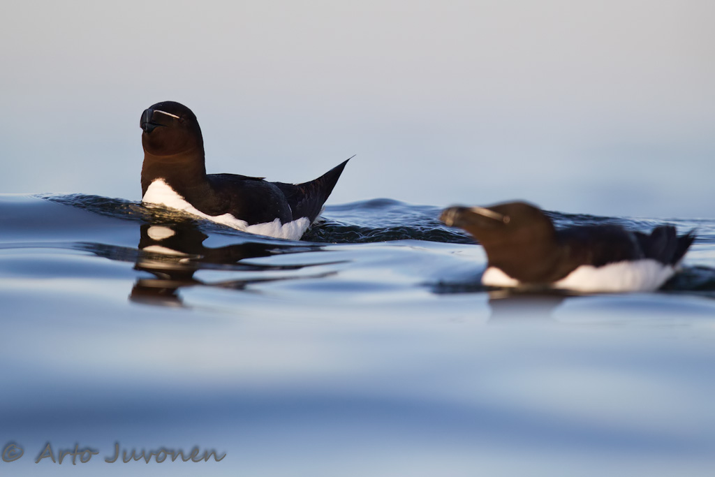 Normally I save the best pictures in the picture of the week blog, and I do not publish any of good ones elsewhere prior to publication here. This one I did not thought to put as picture of the week, because images of Terns have been many so many here. That's why I published the picture in the face book already freshly on Tuesday. There the image received popularity that surprised me. Likes, distributions and comments are more than any previous publication of mine. I have noticed that the pictures that face book audience appreciates, will not necessarily have similar appreciation here in picture of the week blog. I'm interested to see is it same with this picture as well. In fact I do not place the picture at top, but my taste can be too much saturated with pictures of terns. On Saturday, finally hit a moment of calm sea excursion. I was lucky to get a new species photographed with a floating hide: Razorbill. A flock was swimming in a good light and shooting range. However quite a high waving because hard winds of previous dates made circumstances really challenging. Wonder that even some sharp pictures got to the sensor. Palauteosio ei ole toistaiseksi käytössä