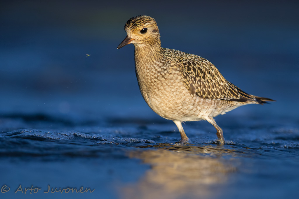 Golden Plover is a new species to me to have close-up pictures. This juvenile was feeding a shore on Saturday evening. The other picture is taken on special conditions, when the setting Sun lights up dark clouds behind the Plover.
