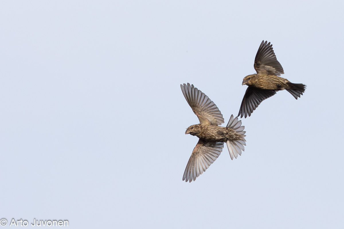Nuoret pikkukäpylinnut - Juvenile Common Crossbills Ei tullut merkittävää käpytikkojen vaellusta itään pitkin rannikkoa. Näyttävät menevän lounaisaaristoon. Sen sijaan pikkäpylinnuilla on tosi kovaa menoa. 18.8. aamulla oli ennustusten mukaan pohjoistuulta, jonka olen oppinut tarkoittamaan keskittynyttä ja matalalla tapahtuvaa muuttoa Hamarin kallion yli ja sivuitse. Eipä tarvinnut pettyä, sillä laskin yli 2000 muutavaa pikkukäpylintua, joista suuri osa matalalla ja läheltä. Aivan sellaista matalamuuttoa ei ollut, kuin oli navakassa vastatuulessa 8.7.2018, jolloin iso osa parvista meni pitkin kallion pintaa. Silti sain nytkin useamman kerran olla "parvenjakajana", kun aivan kallion pintaa mennyt parvi jakaantui kohdallani molemmille puolille - säärteni korkeudella. Kesän aikaan metsissä oli paljon pikkukäpylintuja. Epäilin niiden olevan pesimäpuuhissa, mutta lentopoikueiden kerjuuääniä varmemmaksi en pesintöjä saanut. Nyt vaellusparvissa on paljon viiruisia nuorukaisia. En oikein päässyt perille, minkä ikäisinä tarkalleen nuoret vaihtavat viiruisen asun pois, mutta käsittääkseni "normaaliin" aikaan kevättalvella pesistä selvinneet nuorukaiset eivät enää ole nuoruuspuvussa, vai ovatko?