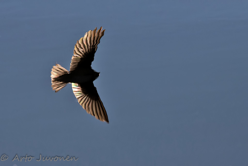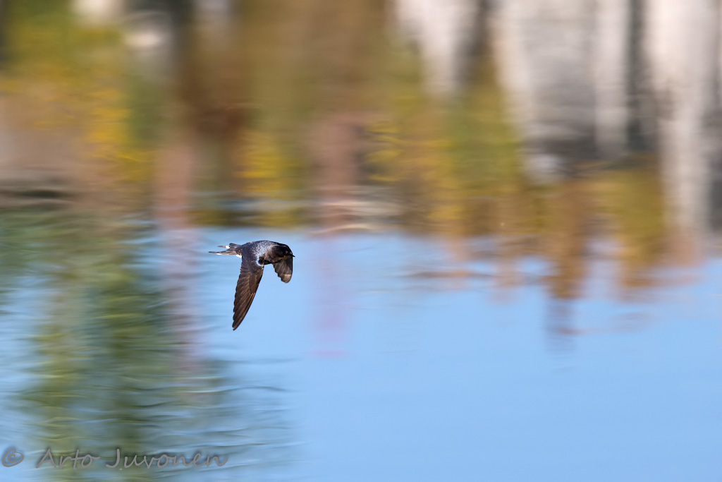 Jaaha, mitä paremmat ovat laitteet ja mitä tarkempaa kuvamateriaalia syntyy, sitä enemmän huomio kiintyy erikoisiin kuviin, joiden ottamiseen riittäisivät ehkä vanhemman sukupolven laitteet. Toki voi olla, ettei moni runko olisi ehtinyt tähän törmäpääskyn heijastumaan tarkentaa. Viikkarin valitsija tykkäsi kylläkin eniten alla olevasta haarapääskykuvasta, jossa lintu poimii hyönteisen vedenpinnasta. Viikkari valittiin kuitenkin erikoisuuden perusteella. . Pisteet varmaan jakaantuvat, mutta ainakin tämä herättää mielipiteitä. Jo heti etsimen läpi nähtynä oli selvää, että nyt syntyi jotain erikoista. Mutta kuinka tuollainen heijastuma on yleensä mahdollinen? Linnun takana auringon suunnassa oli tumma uivan telakan runko. Aurinko osui lintuun, mutta runko varjosti veden pinnan