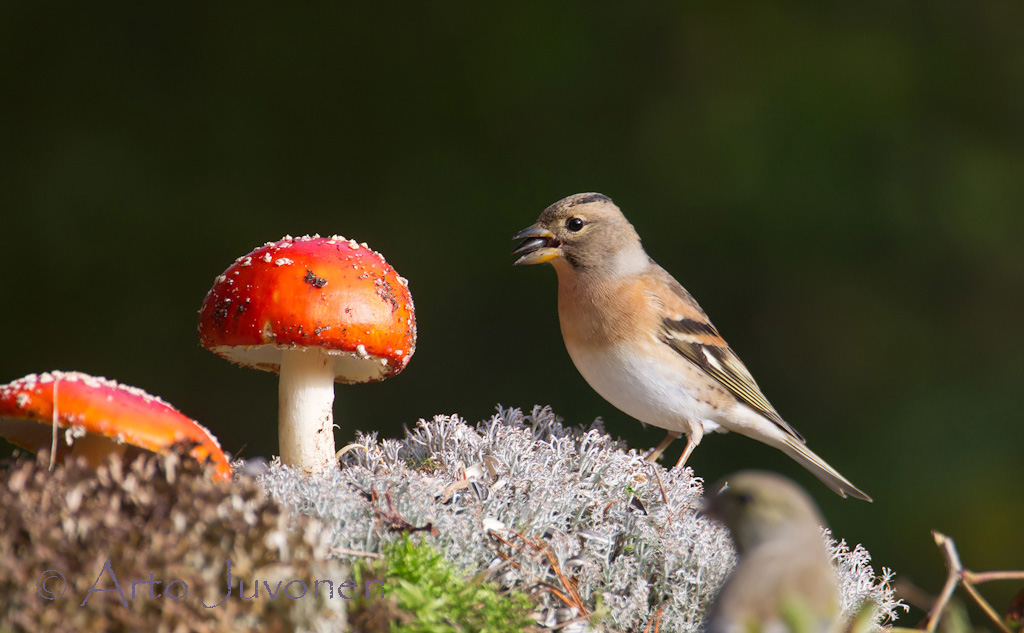This autumn has been very wet and warm. That means lot of swamps in woods. Here is a Brambling among fly Amanitas Amanita muscaria
