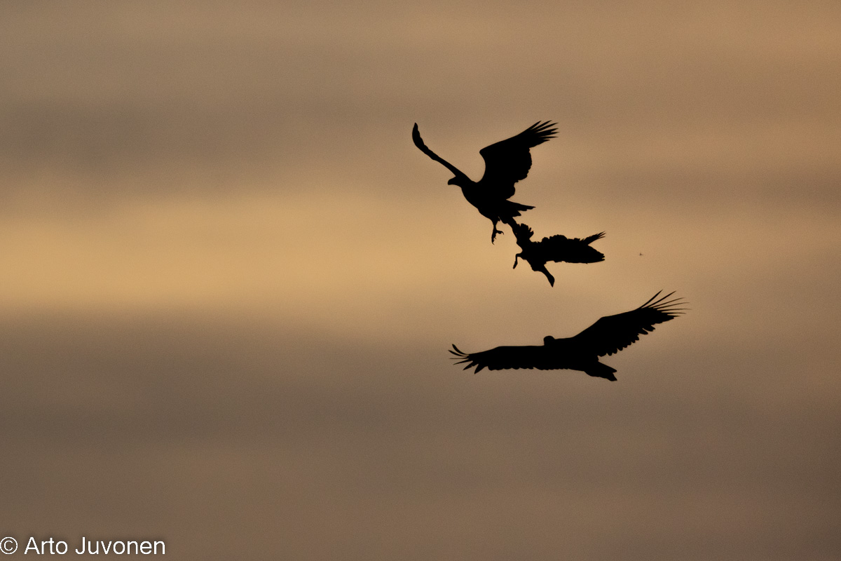 Viikkarissa on luonnon dramatiikkaa aamun sarastuksessa. Vanha koiras merikotka saalisti aktiivisesti kiitäen vauhdilla ja väsymättä kilometrejä pitkin pellon pintaa, kunnes joku onneton hanhista ilmeisemmin jäi muista jälkeen ja kiinnitti merikotkan huomion. Takaa-ajoa taivaalla kesti minuutin verran, johon sisältyi kaksi hanhen onnistunutta väistöliikettä. Alhaalta pellosta ponnisti takaa-ajoon lyhyeksi aikaa mukaan nuorehko naaras, jonka aiheuttama lisäpaine varmaan helpotti kuvan tilanteen syntymisen. Tyypillistä näille tilanteille on, ettei itse saalistaja saa pitää työnsä tuloksia. Nuorukainen vei saaliin konkarilta, mutta epäonnekseen laskeutui peltotielle. Tuli auto, eikä kotka saanut saalista mukaansa. Hanhi näkyi räpiköivän ojaan piiloon. Seurasin vähän aikaa tilannetta, ja kun kotkat eivät näyttäneet löytävän uhriaan, kävin minä sen etsimässä ja vein sen sitten järvelle. Se osasi lentää muutaman sadan metrin päähän rannasta, jonne laskeutui uimaan. Hanhen ennuste ei varmaan ole kuitenkaan hyvä.