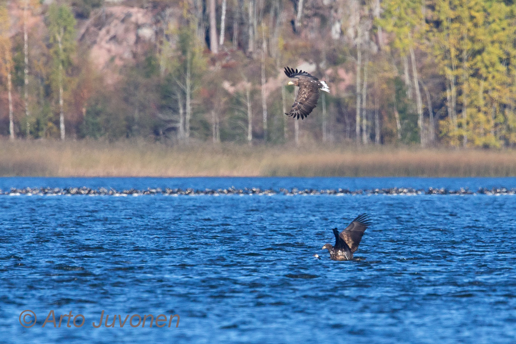 Sunnuntaina näin pari epäonnistumista vauhdikkaassa takaa-ajossa, sekä saalistuksen vedestä, joka oli kuin toisinto lauantai-illasta. Samat kaksi merikotkaa väsyttivät muusta parvesta erilleen jäänyttä hanhea. Tällä kertaa tuli uistelijan vene, joka katkaisi kotkien saalistuksen. Kovia kokenut hanhi ajautui vähitellen rantaa kohti. Tämä oli sitä oikeaa avaraa luontoa, mutta tuli vähän paha mieli turhasta tuskasta.