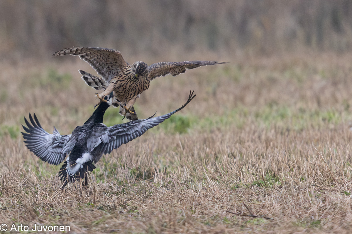 Pukarolla on jo pitkän aikaa viipynyt korjaamattoman ohrapellon antimia nauttimassa pienenevä, mutta yhä tuhansia käsittävä valkoposkihanhien joukko. Koska saalistettavia on tarjolla, kertyy pitoihin myös kanahaukkoja ja merikotkia. Ensin mainittujen määrää on vaikea tarkkaan laskea, mutta eilen ja tänään paikalla oli ainakin kaksi nuorta ja yksi vanha lintu. Kuvio on selvä ja vanhastaan tuttu. Kanahaukat tekevät vauhdikkaita saalistuksia, ja joko saavat hanhisaaliin alas, tai ainakin vahingoittavat kohdettaan. Sitten tulevat kotkat. Tänään kanahaukoilla oli hyvä aamupäivä. Näin kolme yritystä, jotka kaikki päättyivät onnistumiseen. Mutta mutta, kahdessa tapauksessa haukat eivät päässeet alkua pidemmälle saaliin repimisessä, kun merikotkat saapuivat. Parhaimmillaan kahden hanhen raadoilla ruokaili tai tähteitä norkoili viisitoista merikotkaa, joka taitaa olla ennätykseni hanhipelloilla nähtynä. Kolmannella kerralla nuori kanahaukka sai hanhisaaliin aivan autoni tuntumaan. Sai nyt ainakin aloittaa saaliin repimisen rauhassa. Luulenpa kuitenkin, että kohta poistumiseni jälkeen kotkat tulivat häätämään kanahaukan pois hanhipaistilta. Useamman päivän hakkasin klapeja Torpan pihalla hanhiparven tapahtumia seuraten, kamera vieressä valmiina, mutta en aktiivisesti hakeutunut tilanteisiin. Tänään ajoin autoni peltotielle hanhilauman keskelle, ja edellis syksyiltä totuttuun tapaan odotin kamera valmiina. Kahden tunnin aikana tapahtui paljon ja lopuksi pääsin suhteellisen läheltä kuvaamaan oheisen tilanteen. Siinä haukka oli saanut jo hanhen alas, joka - selvästi vahingoittuneena - oli jo päässyt kertaalleen irti. Hyvin usein haukka luovuttaa vastaavassa tilanteessa, mutta nyt onnistui nujertamaan saaliinsa uudella yrityksellä.