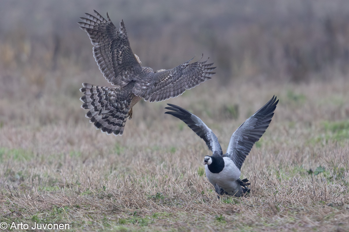 Kanahaukka ja valkoposkihanhi Northern Goshawk and Barnacle GooseAccipiter gantiles & Branta leucopsis Lapinjärvi, 22.10.2023 Canon EOS R6, 500 mm, f/4, 1/3200 sec, ISO-2500. Hand held | |||