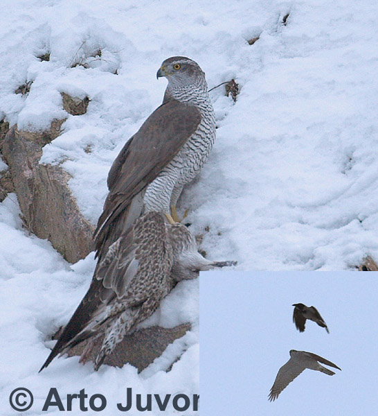 Kuvassa kanaukka saaliinaan nuori harmaalokki Goshawk, adult female with a young Herring Gull Accipiter gentiles Porvoo, Finland 10.12.2005 Canon 20D, 500 mm f4/L IS USM |