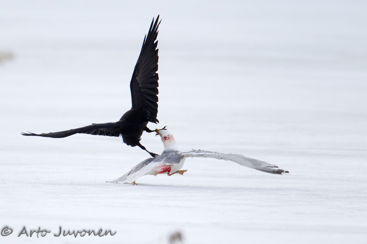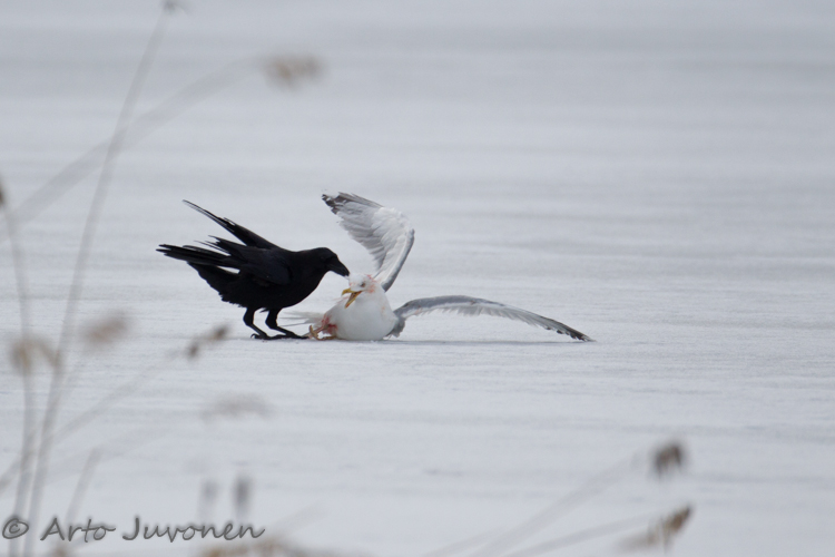 Juhan tarinassa korppi sai toisen kaveriksi, mutta kalanpään herruus ei sillä ratkennut. Kuuden korpin yhteistoiminta ratkaisi tilanteen mustien lintujen eduksi. Minun tarinassani ei leikitty. Yksi onneton haraalokki ei ehtinyt väistyä lahnan ääreltä korpin taas palatessa. Nyt korpille ei riittänyt, että harmaalokki tajusi yrittää pakoon korpin syöksyessä sen selkään. Seurasi noin viiden minuutin taistelu "yhteen maaliin". Verinen näytelmä päättyi harmaalokin kuolemaan.