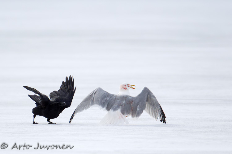 Juhalla tarina syntyi lohen pään, minulla jäälle jätetyn lahnan ympärille. Lohen päästä kiinnostuivat kaksi harmaalokkia, lahnan ympärille kerääntyi kymmenisen harmaalokkia ja muutama varis. Seuraavaksi molemmille näyttämöille ilmestyi korppi. Juhan paikalla haaskan ääreltä siirtynyt korppi otti jutun ilmeisesti leikin kannalta, mutta joka tapauksessa ei pärjännyt kahdelle harmaalokille. Lahnan ympärillä kaikki väistivät kiltisti korppia. Korppi repi nokallisen lahnaa mukaansa, lensi jonnekin viemään löytönsä varastoon, ja palasi hetken päästä hakeakseen taas uuden lastin.