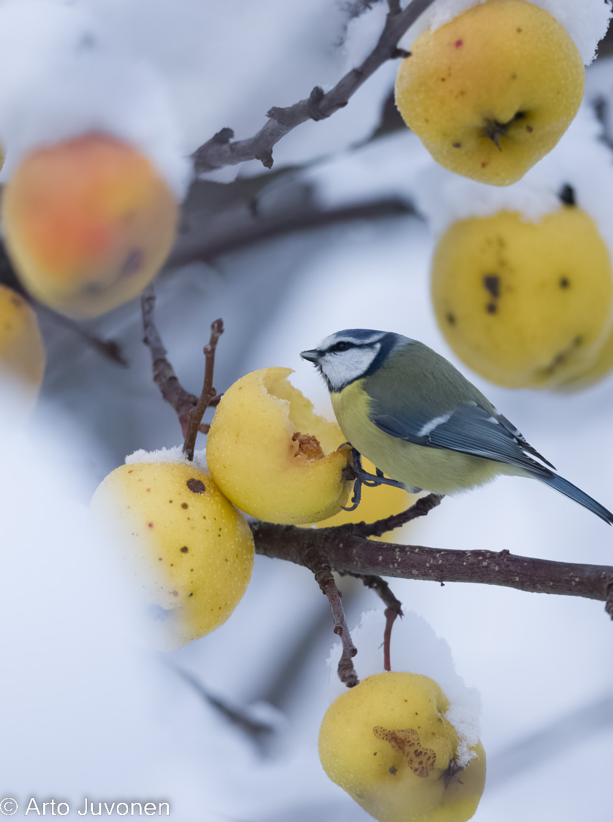 Villinä kasvanut omenapuu on kantanut tänä vuonna tosi runsaan sadon. Nyt puu tarjoaa ruokaa monille siivekkäille. Lukumääräisesti ahkerimmat vierailijat ovat sinitiaisia. Ehkä yllättävin omenoita hyödyntävä vieras on ollut harmaapäätikka, jonka olen nähnyt pariin otteeseen omenia takomassa.