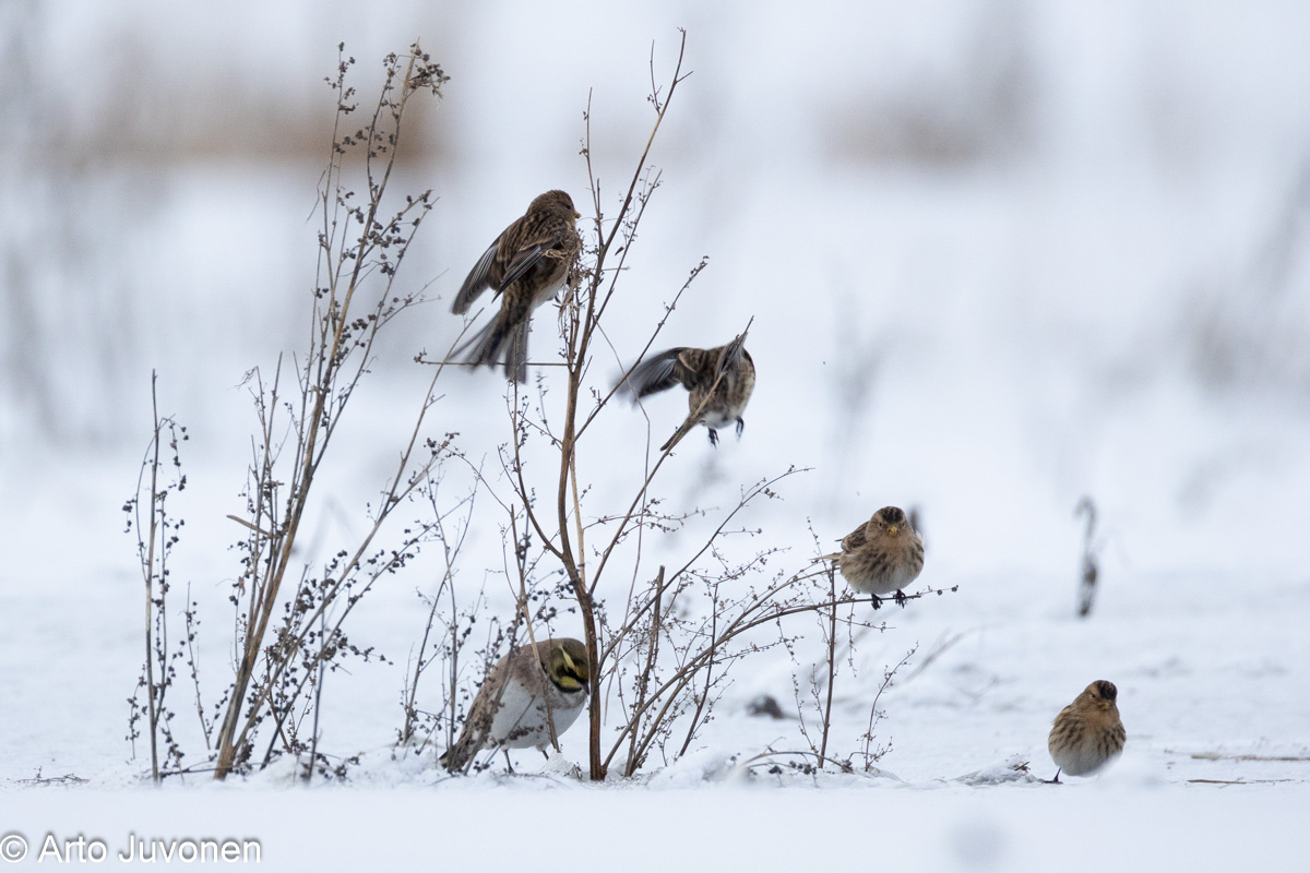Tunturikiuru ja vuorihempot Horned Lark and Twite Eremophila alpestris & Carduelis flavirostris 14.12.2024.2024 Pukkila Canon EOS R6, 800 mm, f/10, ISO-1600, 1/500 sec, Hand held | |||