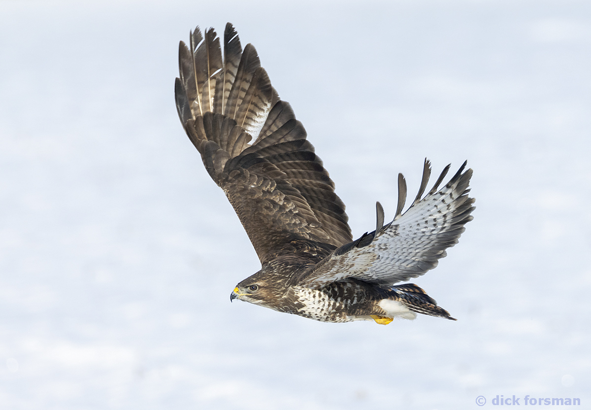 Plumage and moult studies of wintering Common Buzzards (Buteo buteo) seem to be coming to an end. This was perhaps the last possibility to shoot them in flight over glistering snow fields? Since then the snow is all gone. |