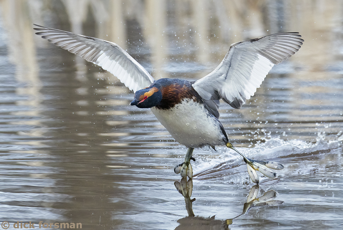Territorial feuds are frequent as the Horned (Slavonian) Grebes (Podiceps auritus) are settling the boundaries of their territories. This male has just chased off one of its neighbours. |