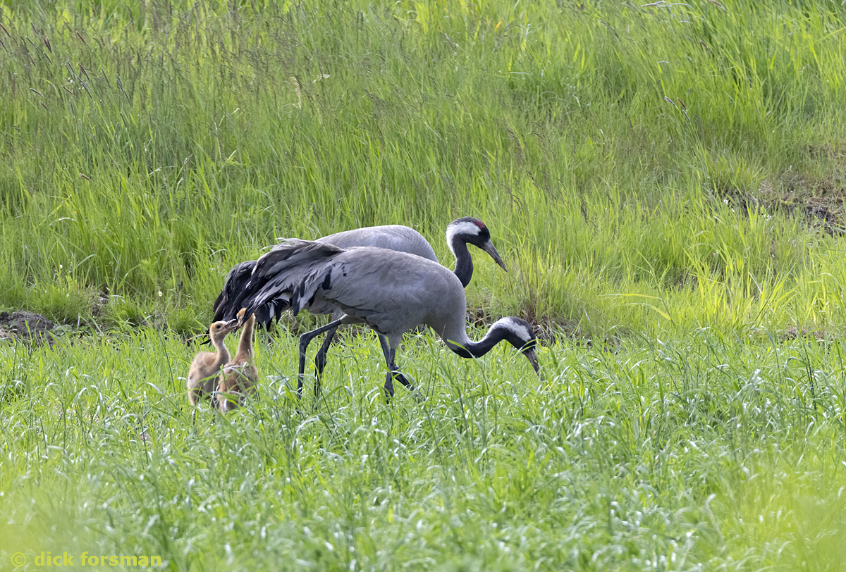 Our nearest neighbours, a family of Common Cranes (Grus grus) are happily looking for food together. Last year the pair also had two chicks to begin with, but one disappeared during the first weeks, most likely predated upon by something. |