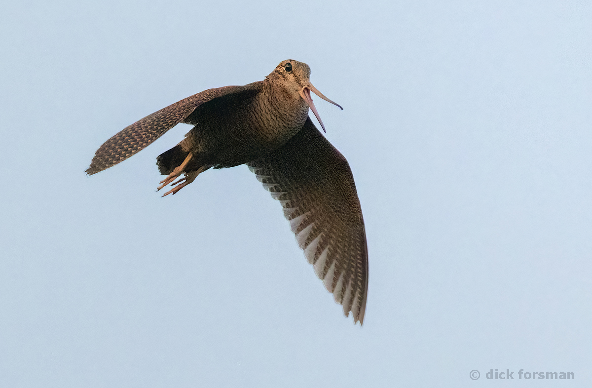 Woodcocks (Scolopax rusticola) are still busy roding and "singing". The bill is kept open only when the bird delivers the so called Sneeze-note at the end of each phrase, while it is kept shut during the preceding grunting Snore-notes. |